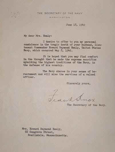 Secretary Knox to my Grandmother. News of the loss